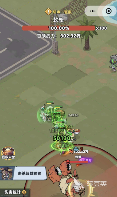 进入到晴天海岛地图之后,玩家会遇到螃蟹boss,想和这个怪物对战难度非常高,螃蟹防御能力比较优秀,挑战过程中还有极高血量,短时间内如果无法打掉对方的护甲,玩家会受到大量攻击的同时,螃蟹会不断回血,对战起来难度会更大,玩家多选择几个不同的角色上阵,首先必选的就是坦克角色,可以使用飞龙骑士或者变异人,利用角色的较高坦度能抵抗螃蟹大量攻击,在这个基础上,玩家可以搭配齐天大圣,丸子头,利用两个战士角色,打出较高的输出伤害。