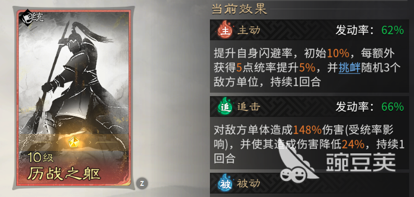 技能配置围绕“闪避率堆叠—反击触发—状态净化—持续续航”四大目标展开: 赵云主技能锁定【历战之躯】,提供基础闪避加成与群体嘲讽,且每点统帅属性额外提升0.5%闪避率;追击与被动统一选用【虚实相生】,开场即叠加闪避,并在反击时施加护盾与增伤效果。 甄姬主技能【凌波微步】兼顾治疗与闪避增益,被动与主动同源,强化团队生存;追击固定【阳春白雪】,兼具兵力恢复与负面状态清除功能。 太史慈主技能【决水破敌】覆盖全体伤害并附加溃逃效果;被动【兵无常势】保障前三回合全队减伤,有效抵御开局爆发。