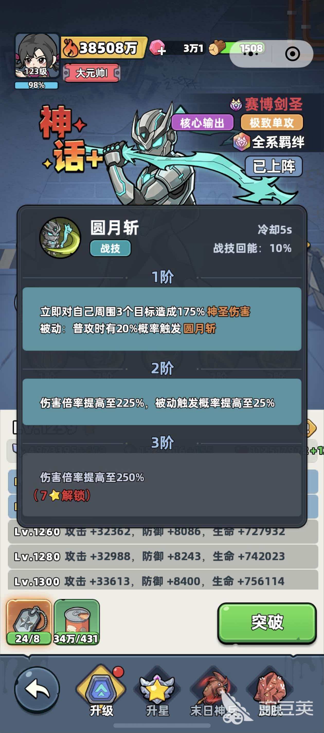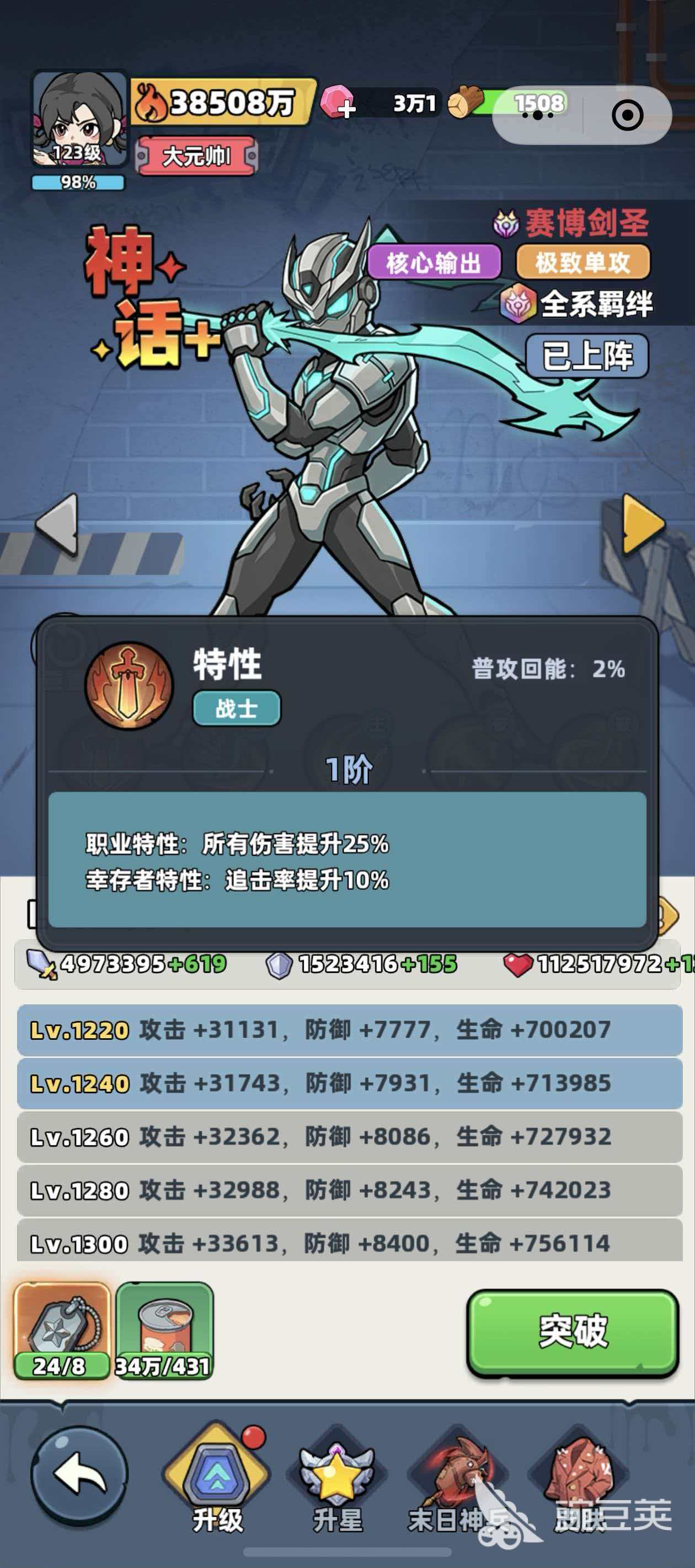作为一个单体输出极为强势的幸存者,赛博剑圣的职业特性也显示出了强大的伤害,他的职业特性为所有伤害提升25%,幸存者特性则为追击率提升10%,这两种特性增强了赛博剑圣的攻击力,圆月斩作为剑圣的战机,是一个可以对自己周围3格目标造成175%神圣伤害的技能,此外,在普攻时还会有20%的可能性触发圆月斩。