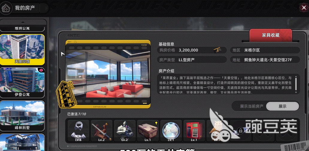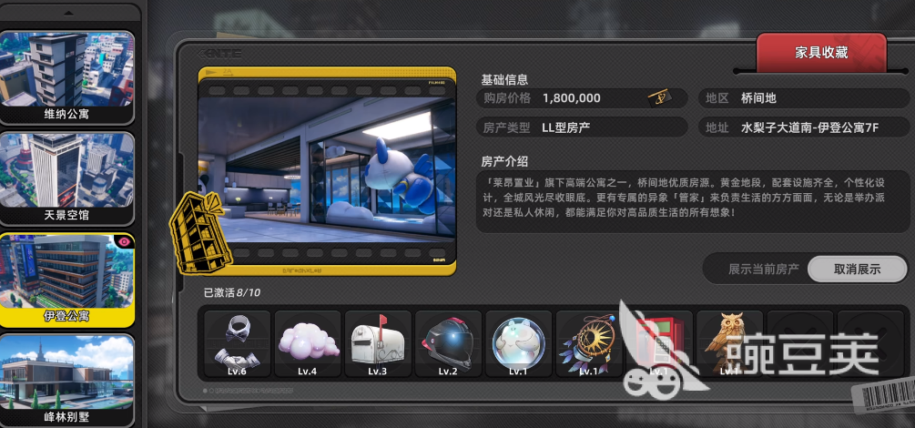 游戏里玩家可以购买大量房产,每个房产都会有对应的异象家具,完成特定任务之后,玩家就可以顺利获得物品,每个物品都会有独特的作用,平时也可以作为摆一件装饰房间,每个房产都会绑定特定的异象家具,玩家如果想获得何人的头盔,需要购买伊登公寓,具体的购房价格和地区,会在购买的时候详细展现出来,玩家把地图缩小之后,能直接点击跳转到公寓,购买公寓之后,玩家可以直接查看到页面上所有等待激活的异象家具。