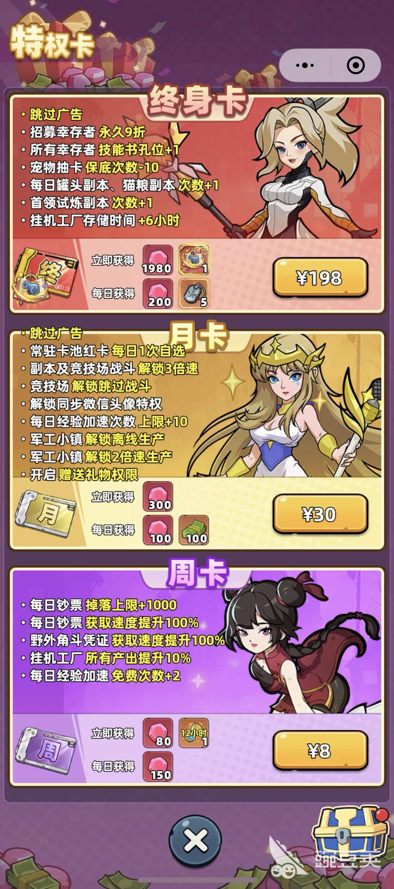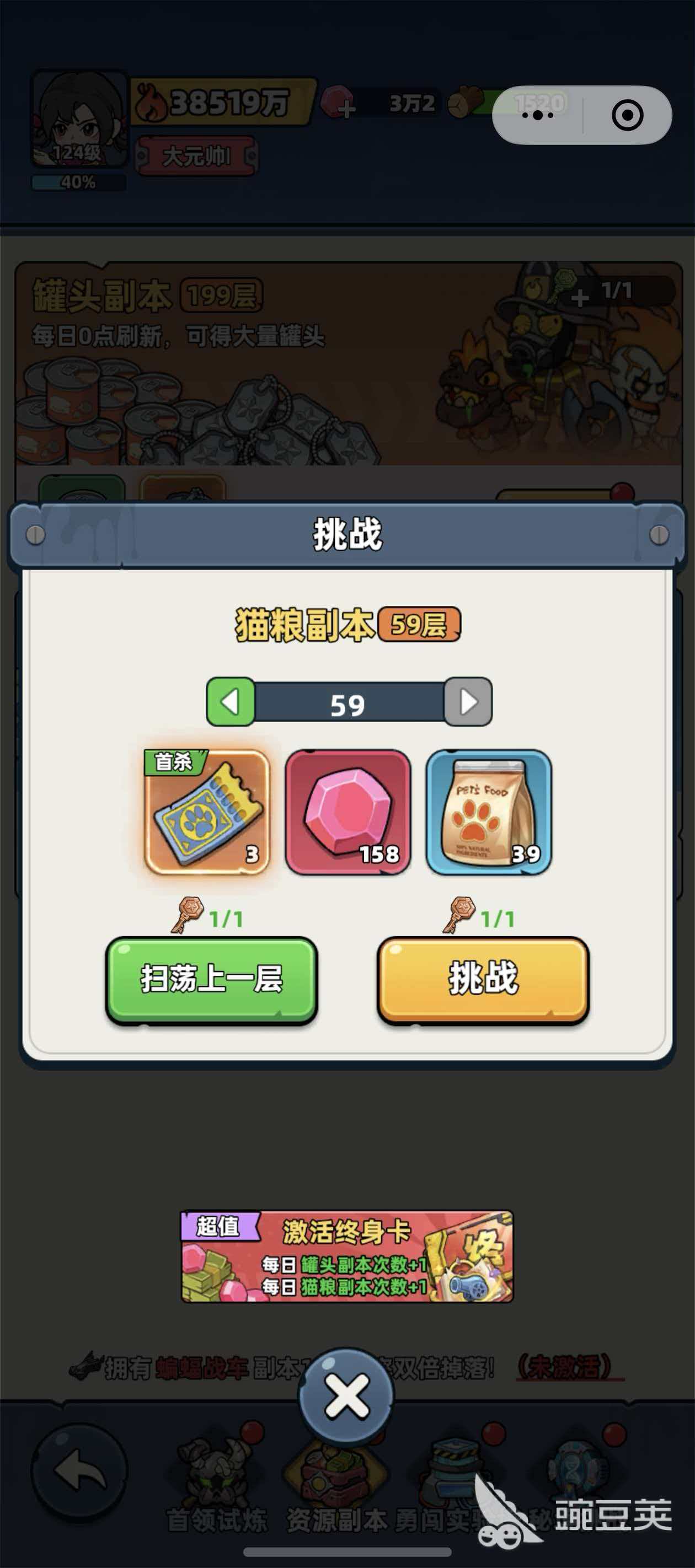 玩家每天可以挑战2次猫粮副本,低次挑战可以直接开启,第二次挑战就需要玩家通过看广告来获取开启挑战的钥匙了,当然了若是玩家将特权卡中的终身卡给开通了,每天还能够在获得1次额外的挑战次数,挑战时会出现扫荡上一层和挑战两个选项,玩家可以根据自己当前的战斗力来选择,若是挑战当前层数失败的话,那消耗的钥匙也会返还给玩家,扫荡上一层是没有首杀奖励的哦。