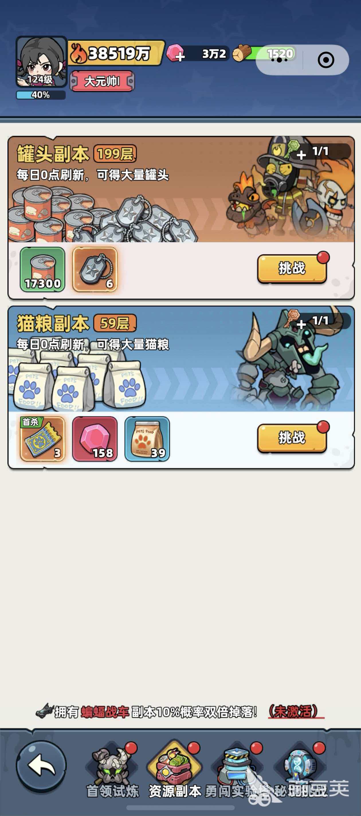 第二种获取猫粮的方式就是通过资源副本,资源副本就在挑战大厅里面,在资源副本中有罐头副本和猫粮副本,猫粮副本需要玩家的等级到了排长才能解锁,猫粮副本相对罐头副本要更加难打一点,每一次完成猫粮副本,玩家都可以获得158个钻石和39包猫粮,若是玩家完成了猫粮副本的首杀的话,还会获得3张宠物契约券。