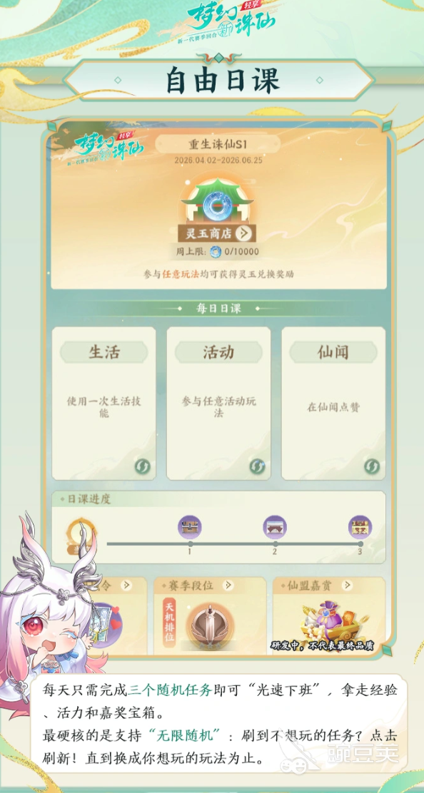 除了段位系统的改革之外,游戏在日常玩法上的减负也做得最好,推出了很人性化的“日课无限刷新”系统。每天只需要完成三个随机任务就可以“光速下班”,获得经验、活力和宝箱。最硬核的,就是如果刷到不想玩的任务,玩家就可以点击刷新,直到换成自己想要的玩法为止。配合每周灵玉上限的设定,玩家只需要选择自己想要的玩法就可以拿到全部的核心资源,不需要为了资源而强迫自己。
