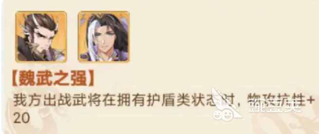 此时他只要是拥有护盾保护的话,那么这个状态可以为他带来策攻击抗性的15点增强,所以在对面如果用到策略攻击效果比较多的情况下,我方可以抵抗的数值也比较高,那么这里通过郭嘉跟曹操搭配在一起,他们可以触发的一个连携效果叫做魏武之强。这个能力就是让我方出战武将在拥有了护盾类型的状态时,让物攻的抗性增加10点,效果放在这里的话其实大家就可以发现,魏国里面基本上大家通过连携触发的这一效果当中,大部分都是带有抗性的能力,所以这个阵容是非常有自我生存强度的一个搭配。