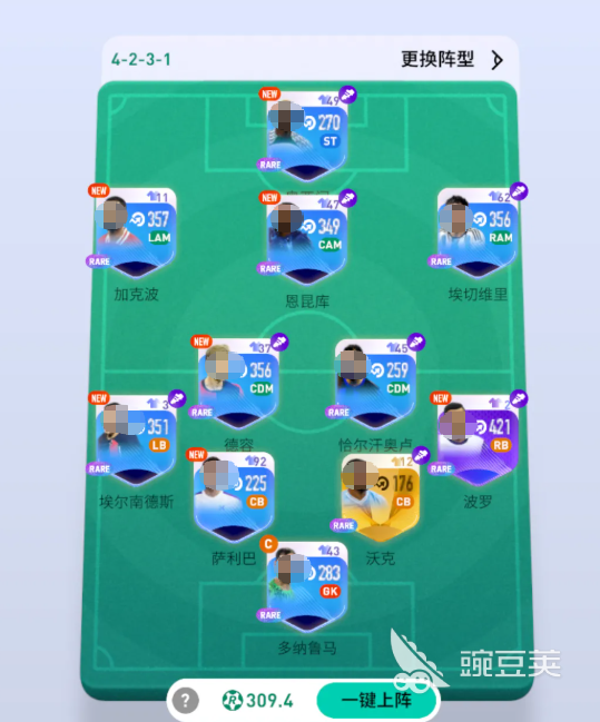 这个球队当中的搭配起来的阵型可以用4-2-3-1,这个阵型可以让我方球队当中大部分的球员得到足够最多的加成,而在这个阵容里面大家可以用的球员就是加克波、恩昆库、埃切维里,德容、埃尔南德斯、萨利巴、恰尔汗奥卢、波罗、沃克、多纳鲁马,这个阵容里面只有一张金卡,而其他的球员效果其实都是有比较高的数据数值,比如说这里的紫卡菠萝是目前唯一一张强度最高的球员卡,用起来的情况下,大家可以带来的整体阵容天赋其实是非常重要的,而且这个阵容里面后期替补席上面大家放一些金卡也是完全够用的,大家要记得,后期不同的定位角色在带技能天赋上面是不一样的,比如说这里的中锋角色,也就是德容、恰尔汗奥卢这些角色,大家如果给他带天赋的话,大家可以带终结者,或者是空霸必备此类效果。