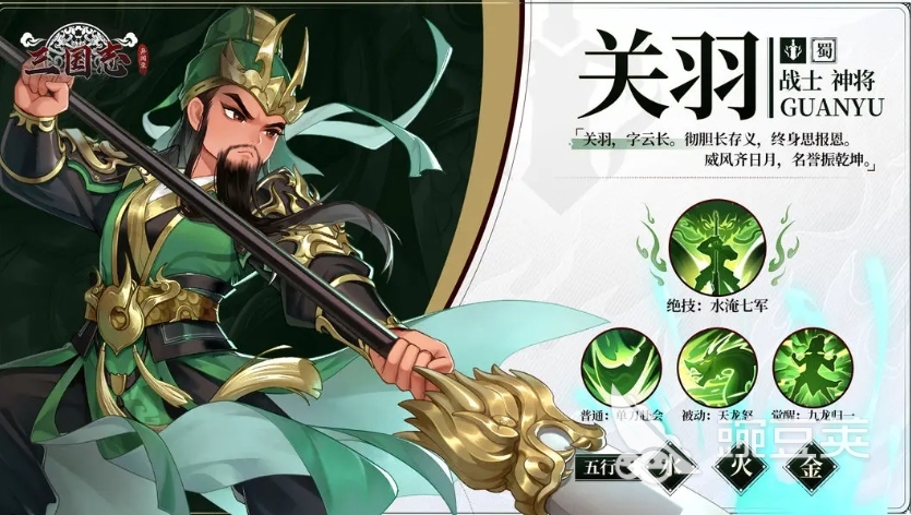 第二个为大家推荐的就是关羽,关羽目前在群体的输出效果上面,大家只要掌握好节奏就可以用到他的各种打击能力,在群攻类型技能当中具有的一个爆发输出能力,很少有其他武将能够有这样的强度,因为他在控制能力上面也是非常亮眼的,这里攻速比较快的阵容都可以放一个关羽,他自身敏捷属性也是能够带来此类输出的特点原因之一,在没有怒气状态加成的情况下,他同样可以带来不错的远程技能,后期培养成型之后,他锁定敌人进行输出的同时,可以直接针对敌人脆弱的后排,而且被动能力同样可以通过武圣这类buff的叠加带来足够多的血量恢复,所以放在这里关于自身的生存强度也是不容小觑的。