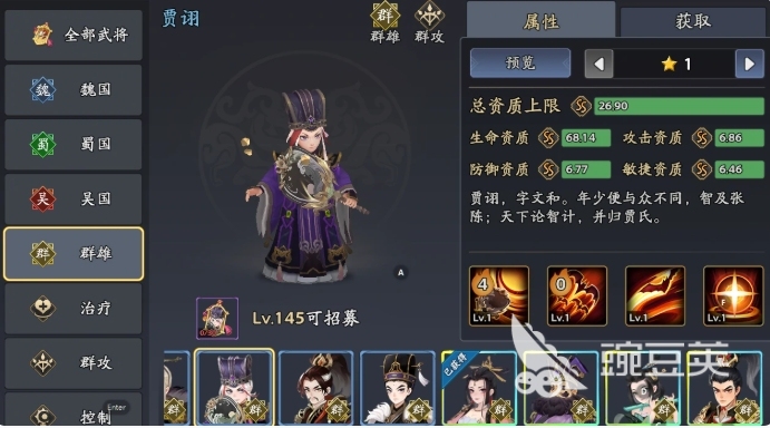 第三个为大家推荐的就是贾诩,贾诩培养起来之后。作为一个群体输出武将非常适合放在中毒流里面,因为他可以施加给敌人的控制能力当中具有中毒此类效果,在增强了他的输出循环机制之后,可以跟其他中毒流的角色搭配在一起形成一个协同的阵容搭配之后,他的被动能力,可以让他在跟一些有中毒状态影响的敌人进行比拼的时候,此时受到敌人攻击伤害会减少25%左右的数值,并且他根据自类重伤状态给敌人施加的大招伤害也会提升40%,所以根据这样的一个状态加成他不管是减伤还是增伤,都是可以快速的反制敌人的。