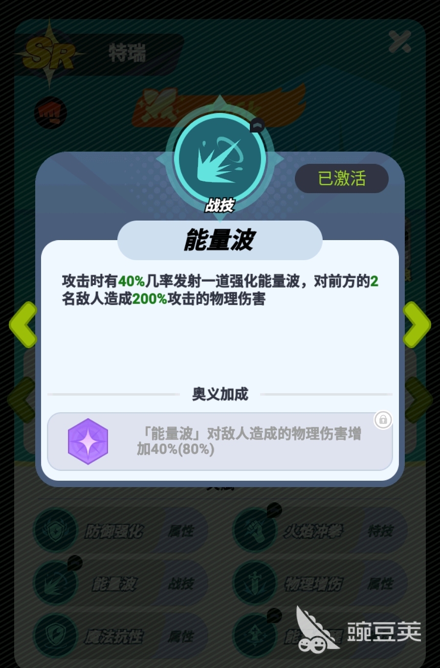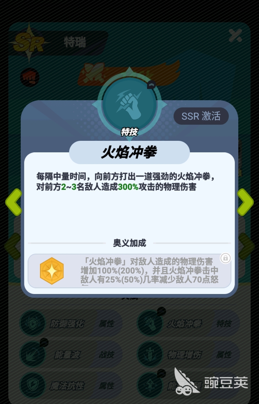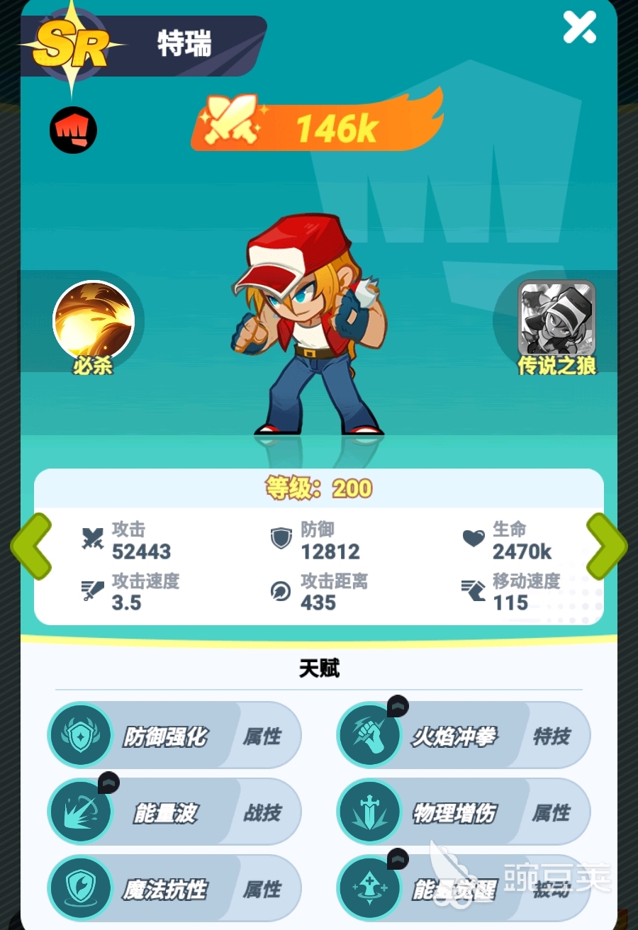 特瑞的战技可让他在攻击时有概率打出能量波,对自己前方的两名敌人造成伤害,该技能的命中目标为固定人数,即便两名敌人相隔得很远,特瑞都能在能量波命中第一名敌人后让第二名敌人也受到伤害,而且该技能倍率很高,要是特瑞在实战中频繁触发战技效果,即便是御守格斗家也很难扛住,这也令特瑞能十分效率地击杀敌人前排。若配合上他在SSR品质时解锁的特技技能火焰冲拳一同使用,那特瑞拆前排的能力会得到更进一步的提升。