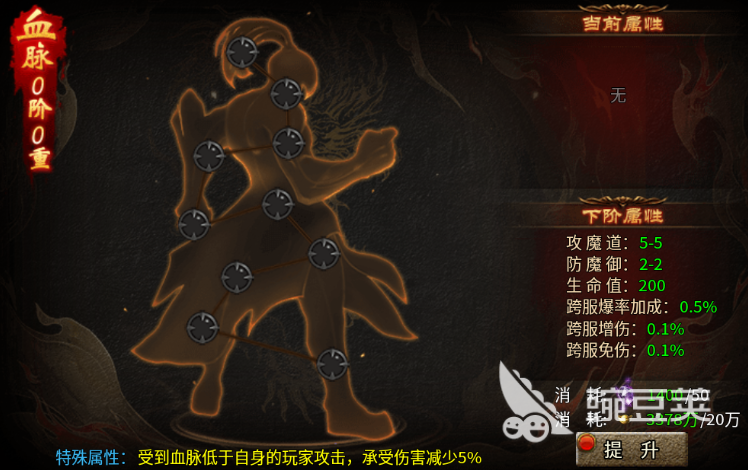 当然如果想要提升自己自身效果的话,这里建议大家前期一定不要错过血脉这个系统,在血脉系统当中,大家消耗更多的紫灵石以及元宝,就可以进行血脉提升,血脉提升当中,一个阶级里面还有不同的重级,所以每次提升一个阶级之后,大家就可以看到其中还有足够的跨服爆率加成,以及各种跨服增伤和跨服免伤数值变化,如果大家后期喜欢玩跨服战斗的话,这个血脉是非常重要的一类增强系统,跨服战斗时血脉低于自身的对手,大家受到的伤害也会减少5%,所以在后期的跨服作战当中,如果有血脉压制能力的话,大家是会有更多战斗功能可以用到的。