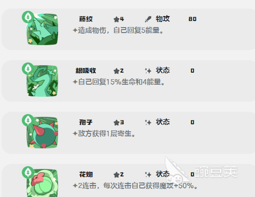 草系属性就会让他天生去克制光系精灵,地系精灵,还有水系精灵。在面对这三类属性的对手时,就可以直接打出一个压制性的伤害,同时还能有效抵抗水系,地系、电系、光系的攻击。在属性对局的过程中,就能够占据绝对性的优势,但是要避开火系、冰系,还有毒系精灵。这些属性就会对它形成克制,实战中合理的换宠物才可以发挥更多的实力。输出端也会有魔攻核心技能,例如光能聚集,在每次释放时还可以叠加威力。
