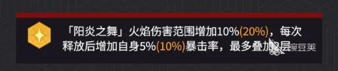 阳炎之舞是她的特技,每隔一段时间会自动召唤一道火焰随机攻击一名敌人,火焰落地之后对范围内的敌人造成300%攻击力的魔法伤害,还附带1秒眩晕。这个技能的好处是全自动的,不需要手动操作,打群怪的时候特别省心。奥义加成之后火焰的伤害范围增加10%到20%,而且每次释放之后还会给自身叠加5%到10%的暴击率,最多叠2层。也就是说打着打着,不知火舞自己的暴击就上来了,后期输出会越来越高。