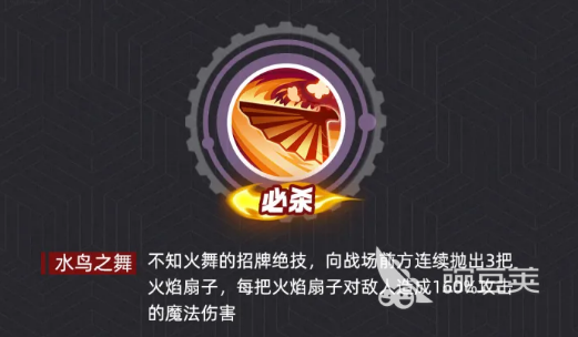 先说她的招牌技能——水鸟之舞。这个技能是她的必杀技,释放之后会连续向前方抛出3把火焰扇子,每把扇子都能打出160%攻击力的魔法伤害。三把加起来就是480%,这个数字已经很可观了。而且这个技能有奥义加成,首次释放所需的怒气可以降低10%到20%,也就是说可以更快地打出这一套。另外每次投掷的扇子数量还能额外增加1到2把,伤害直接往上叠。所以水鸟之舞不是那种看起来厉害但实际一般的技能,配好奥义之后真的很痛。