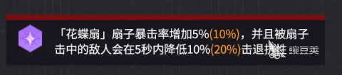 然后是花蝶扇这个战技天赋。这个天赋的触发是随机的,攻击时有40%的概率抛出一把带火焰的扇子,造成300%攻击力的魔法伤害。40%听起来不算高,但实际打起来触发频率还挺稳的,尤其是打输出节奏比较快的关卡,经常能看到扇子飞出来。奥义里面还有一条专门强化花蝶扇的,扇子暴击率增加5%到10%,被扇子打中的敌人还会在5秒内降低10%到20%的击退抗性。这个效果配合水鸟之舞一起用,敌人基本上就是被扇子追着跑的状态。