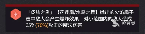 奥义系统里面还有一条叫「炙热之炎」的加成,花蝶扇和水鸟之舞抛出的扇子击中敌人之后会产生爆炸,对小范围内的敌人造成35%到70%攻击力的魔法伤害。这个爆炸效果看起来数值不高,但胜在范围伤害,打密集的敌人群体的时候额外收益很明显。