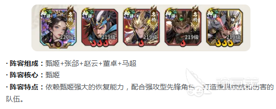 如果喜欢稳扎稳打,那鼓舞强弓流相对是比较合适的。核心就是用甄姬去搭配张郃、赵云、董卓、马超。甄姬就是这套阵容的定海神针,会有超强的恢复能力,可以让队伍的血线一直保持健康,并不需要担心打持久战。前排有董卓抵抗伤害,马超还有赵云双强攻先锋,可以负责打伤害,不管是在什么样的场景中,容错率都是比较高的。