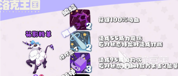第三个是花影羚羊,偏控制方向。她可以带蝙蝠技能,直接吸走对面的血量来补充自己,生存压力比较小。除此之外,她还有两个控制技能,一个是阻挡,能打断对面正在释放的技能;另一个是惊吓盒子,可以直接减少对面两格能量,让他们短时间内没办法快速回到高能量状态。