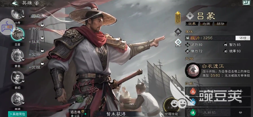 第三个大家可以培养的武将叫吕蒙,吕蒙这个武将虽然强,但是目前其实培养起来的玩家不多,因为他在目前团队定位当中更偏向于增益效果,但是很多阵容里面如果没有增益效果的话,就靠主力输出一个武将,也达不到大家想要的强势能力,而有了吕蒙以后,大家玩儿此类阵容才会得到更多的加成,他的天赋数值当中,通过战斗第第一个回合就可以激活自己的追击能力,在这里只要是位于追击格子上面的己方队友,他可以带来一个白衣状态加成,可以带来的就是隐身护盾的能力,而且这个机制的话,不用大家手动去释放,被动就可以触发,所以一开始就保证了我方武将在战场上面的稳定性,所以前期大家需要抗压的话吕蒙就可以上场,包括中期需要发力的话,他也可以掌握一部分的阶段性节奏掌控力,前期比较弱势的一些队伍就可以用吕蒙来保护其中的脆皮武将。