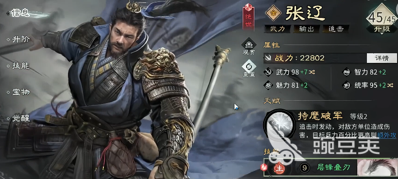 最后大家可以玩儿的就是张辽,张辽在这里走骑兵路线的话还是不错的,一般他在骑兵队伍搭配当中都是作为爆发类型武将使用的,自身天赋效果当中带来的单体追击也比较高,通过这样的逻辑大家可以看到他造成伤害以后,可以通过自动追加的能力,带来更多次的额外的输出,而且在优先选取了一些后排兵力比较高的敌人时,队这些目标攻击的主要效果里面,可以带来168%的基础物理伤害,输出的时候如果敌人的兵力数值是高于他自身的话,那么这里还可以额外附加48%的伤害数值,所以在一轮输出的效果里面,张辽是可以带来双次击打能力的,觉醒了以后,还可以通过兵力来激活决战效果,这里的决战带来免疫控制的时候,他还可以提升自身20%左右的追击伤害,所以自身的反打以及后期破阵的能力都非常强势,玩张辽的话,大家就可以用他的强势能力来进行开荒了,目前在传奇品质当中他也是非常值得拿出来用的一类武将。