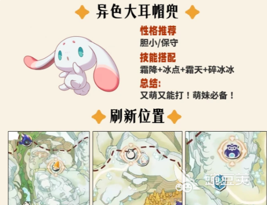 如果喜欢萌系战斗派,不如就选择异色大耳帽兜。看上去真的是又萌又能打,萌妹玩家直接冲。刷新的位置就是在岚语峰上方,雪山boss旁边,还有悬崖传送点全部都可以找到。和前面的两只会有所区别,在选择性格时主要是以胆小还有保守为主,是以法系输出作为核心。霜降+冰点+霜天+碎冰冰的冰系技能组合,这样的技能组合是比较有优势性的,控场加上输出都不会耽误,冰系克制的精灵,在他面前真的是一点还手之力都没有。