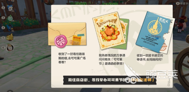 接着从右边直走,来到第1个岔路口,重新右转直行,就能看到两个本地商人,在完成对话之后,就可以解锁第3个线索。接着就会触发几段剧情对话,对话结束之后会进入下一个核心的阶段,解决三个聚会的难题。这三个难题主要是围绕广场区域展开,按照顺序完成即可。第1个是找到三只鸭吉吉,在对话之后选择第3个选项。第2个难题同样是在广场下面,需要拿出星星魔法棒,然后把周围的精灵驱除。最后一个相对会有一些难度,需要唤醒绿色魔力猫。