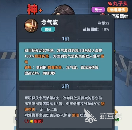 丸子头的平推能力非常强势,在这里通过自身的技能可以带来的优势,就是通过双重真伤带来更高的开局效率,目前在职业特性效果上面,她可以为自身的伤害数值带来25%左右的提升,而对于幸存者特性来说,在物理伤害数值上面是可以带来10%提升的,所以这方面都是双重的提升效果,这样丸子头在开局阶段的话,自身的输出能力就可以快速叠加起来,平民玩家如果拿到丸子头的话,培养她是目前性价比最高的输出选择,而另外她在自身技能效果当中,其实不同星级解锁的能力也不一样,初期可以解锁的战技叫做念气波,通过这个能力,可以进行起手操作,当然了其中有没有真伤能力是非常关键的,通过这个念气波,她可以造成一个直线距离的攻击,其中最大的范围是可以攻击到3名敌人,对所有的敌人造成的是180%的伤害,因为是物理攻击类型的角色,所以这里也是物理伤害数值。