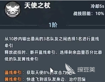 保留一点生命就可以进入到无敌的状态,三秒内马上就可以完成复活,还能恢复相当于天使900%攻击的生命值。在复活之后还有一秒无敌,堪称队友的第2条生命,在战局危急时,总是可以扭转乾坤。冷却只有5秒的天使之杖就是核心的治疗技能,并且还会有10的战斗技能回能。可以给天使提升8%的攻击力,在释放时就会切换为黄线牵引。锁定百分比最低的队友,就能迅速的恢复生命数值,实用性还是比较不错的。