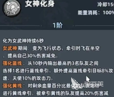 消耗百分百能量的女神化身,在化身的6秒内就会进入到飞行的状态。自身可以得到30%的伤害减免,在解锁强化效果之后,还能给目标提升8%的攻击速度,为自己提升10%的攻击力。黄线牵引就可以让队友能获得20%的伤害减免,同时天使每一秒还能恢复80%的攻击力,生命值可以让团队的作战能力更上一个台阶。在资源的培养上,天使的培养思路和那些高攻型的角色是不一样的,并不需要去追求极致的输出,而是应该优先的提升星级。同时还要推进等级的成长,保证关键技能可以迅速的升级。