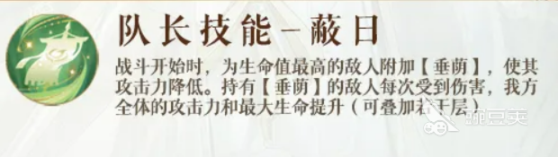 队长技能"蔽日"是开场就能感受到的效果。战斗开始时,血量最高的那个敌人会被附上【垂荫】,攻击力直接下降。而且,只要带【垂荫】的敌人受到伤害,我方全队的攻击力和最大生命就会往上涨,还能叠层。所以庞羲当队长的打法很明确,开局集中火力打那个被标记的敌人,边打边叠全队属性,越打越强。