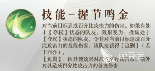 技能"握节鸣金"也是同样的逻辑。没有【夺权】队友就庞羲自己打,有的话就操纵队友打出技能伤害,而且被操纵的队友还会额外获得【追剿】状态,持续若干回合。【追剿】的效果是,队友每次因为其他效果对敌人出手之后,会追加一次普攻伤害。听着不起眼,但叠起来之后每轮都多一次输出,时间长了很可观。