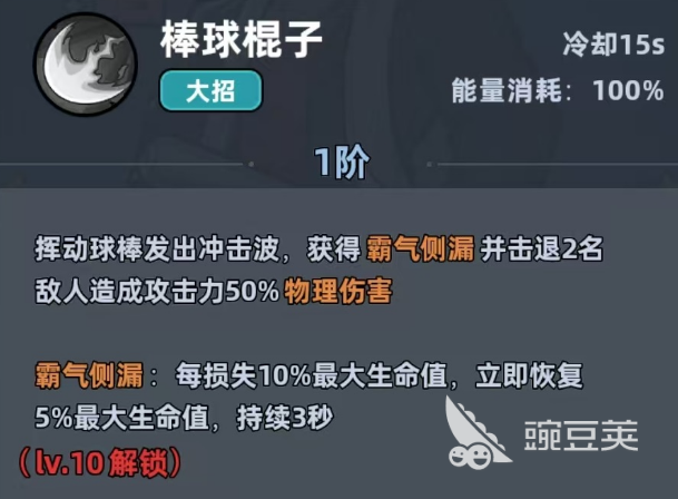 棒球棍子是他的大招,具有15秒冷却,还可以消耗百分百的能量。一节就能挥动球棒去释放冲击波,击退两名敌人之后,并且造成50%的物理性伤害,还可以解锁霸气侧漏的状态。每损失10%最大生命值,就可以恢复5%的最大生命值效果。在10级之后可以解锁二阶大招每击中一名敌人,那霸气侧漏的持续时间就可以额外的增加一秒。团队中击中敌人越多,续航也就越久,残血反打就会成为一种常态。