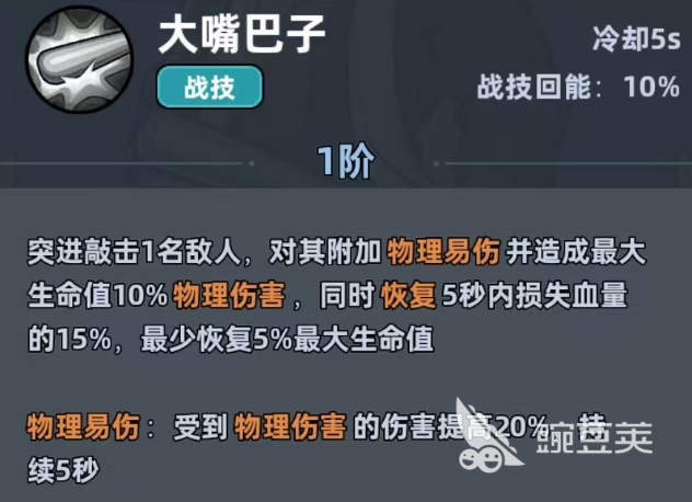 极道大佬核心优点就在于承受伤害能力出色,并且还会拥有较好的续航能力。站在前排就可以抵挡大部分的伤害,他的战斗技能大嘴巴子拥有5秒冷却,搭配10%的战斗技能回能,实用性还是比较出色的。一阶战斗技能可以突进敲击单个敌人可以给对方挂上20%的物理易伤debuff。还能打出目标最大生命值10%的物理性伤害。回血的效果还是比较出色的,可以恢复5秒内损失血量的一部分,就算血线健康,也能保底恢复5%的最大生命值。