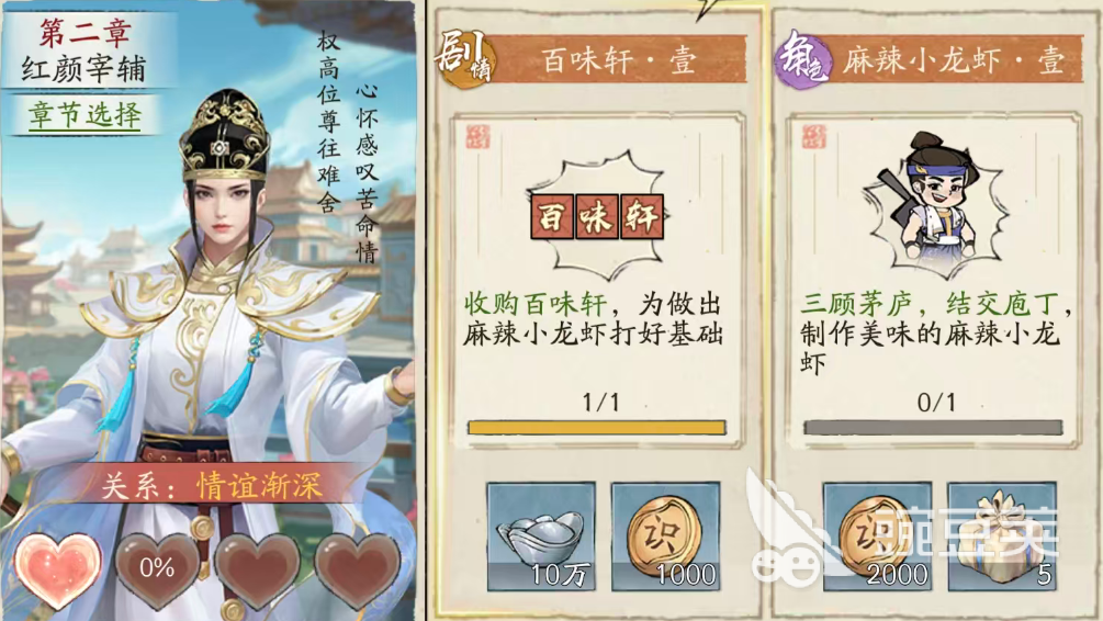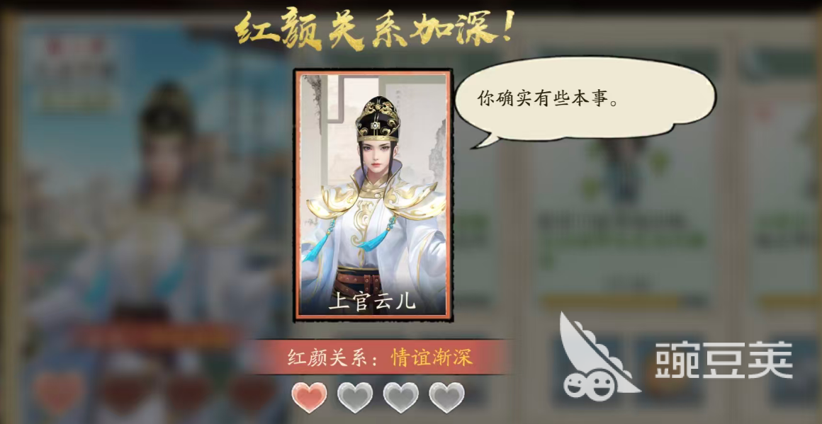 最后第二章节的攻略度也是影响到大家是否能够拿到这个红颜角色的,只要达成其中辞官的故事情节,在这里就算是通关第二章节了,后期大家还可以在专属的红颜系统当中看到女装的上官云儿,而通过各种出游以及赠送物品还可以增加她在红颜系统当中的好感度,这类玩法就跟在主线里面,大家拿到的门玩法差不多,都是可以带来赚钱速度加成的,而且红颜其实跟大家后取的门客放在一起加成的话,大家还可以看到其中出现的羁绊加成能力。