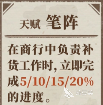 卫铄在游戏里的级别是候级,虽然不是最顶尖的那一档,但用起来很顺手。她最擅长的事情就是理财。先说说她的那个天赋,名字叫笔阵。这个天赋在干活的时候非常有帮助。当她在商行负责补货的时候,可以直接跳过一部分进度,不用死等。最开始的时候是百分之五,等后面大家给她升了星级,最高能直接完成百分之二十。这种直接减时间的技能在后面资源变多的时候特别省事。还有一个点大家要注意,如果把她和王羲之放在同一个城市里,王羲之的属性会直接涨。王羲之的制作和理财都会多出百分之五。这两个人一起出场,效果真的挺明显的。如果把他们两个人都安排在同一个地方,比如苏州或者是那种理财任务比较多的城市,这样干活的效率会高很多,钱也能赚得快一点。