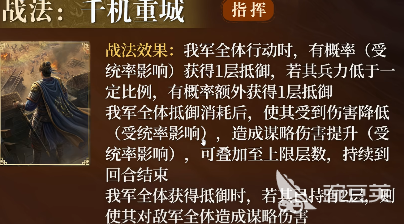 郝昭的自带战法叫千机重城,是指挥类型的。这个战法的逻辑不复杂,但实际效果很可观。简单说就是,我方全体在行动的时候,有概率给自己加一层抵御,如果兵力掉到一定程度以下,还有概率额外多加一层。抵御这个东西用完之后,会让这个武将受到的伤害降低,同时提升造成谋略伤害的能力,这两个效果都是可以叠加的,上限有一定层数,持续到那个回合结束为止。另外还有一个触发条件,就是当某个武将身上的抵御达到两层的时候,会对敌方全体造成一次谋略伤害。这套机制整体下来,既能给自己减伤,又能顺带输出,两头都顾到了。