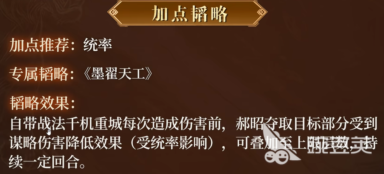 然后是郝昭的专属韬略,叫《墨翟天工》。这个韬略是配合他的自带战法一起发挥作用的。具体效果是,千机重城每次造成伤害之前,郝昭会从目标那里夺取一部分受到谋略伤害降低的效果,这个效果受统率影响,可以叠加到上限层数,持续若干回合。说得直白一点,就是敌方武将原本有一些谋略减伤的能力,郝昭可以把这部分剥过来给自己用。这样一来,敌方更容易被谋略打痛,郝昭自己也变得更抗揍。进攻和防御都往上走了,韬略的收益还是挺实在的。