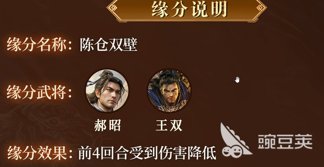 缘分这块,郝昭有一个叫陈仓双壁的组合,搭档是王双。这两个武将凑在一起,前四回合受到的伤害会降低。开局阶段是最容易被对面集火的时候,这个缘分效果顶在最需要的地方,帮助阵容撑过危险期。郝昭和王双本身都是偏防御方向的武将,这个缘分搭起来,整体防御厚度很可观。