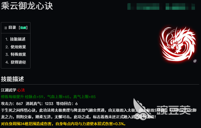 第三个大家可以学的是乘云御龙心决,这个功法当中也算是自带了两个金色的效果,所以用起来的话,两种增伤效果范围都比较有优势,他首先对自身周边24个的范围都可以造成伤害,而在内功以及力道效果上面,都可以让这一次的伤害数值上面增加0.3,使用之后还可以为自己增加一个擒龙的加成,另外有两层的太极效果,所以他这里增生的能力是有非常多的状态进行加成的,持续5个回合当中,擒龙就会让他命中增加30%,并且生效期间可以用任何丐帮招招式来进行输出,不过还有50%的概率会在一个回合里面用到集气减少15%的效果,太极这个状态的话每一层都会让他的伤害减免点增加,可以直接破掉敌人攻击,但是被敌人攻击的时候,这里还会返还本次伤害5%的数值给予对面的敌人,叠加到5层以后,这里的反击就非常强了。