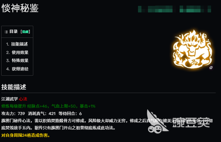 最后第五个就是为大家推荐的惔神秘鉴,这个功法当中大家可以对自身周围24格的位置都可以造成伤害,而且使用的话是不消耗真气的,在对战中使用了之后,每一次为自身带来的加成效果当中都有添加惔神的效果,持续4个回合,所以在其中每一个暴击的伤害都会增加15%之后还会攻击,然后触发一些暴击,那么对自身的惮神来说,是有根骨上面的属性加成效果,另外还有气血的加成,放在这里的也是非常好用的一类百搭功法。