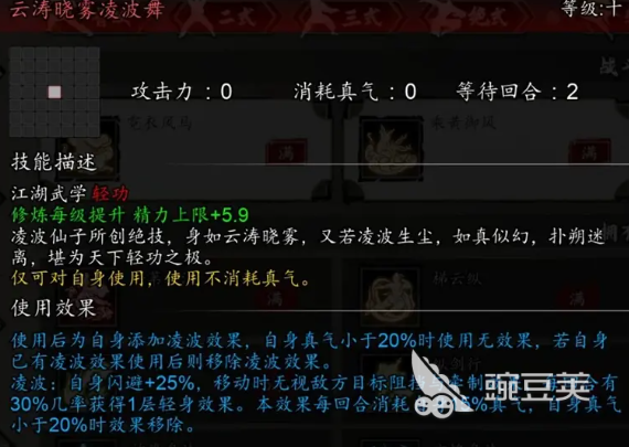 第四个大家可以玩的是云涛晓雾凌波舞,这个算是一类跟轻功有关的功法,在当中只能对自己使用,而且使用的话不消耗真气就可以用出来,用来玩儿连招是非常强的,在这里使用了之后,角色自身会有一个凌波效果的生成,只要是真气数值上面小于20%的话,用起来是没有什么效果的,所以只能在大于20%的情况下使用,如果他自身已经有凌波效果的话,那么这里可以除掉凌波效果,凌波可以给角色的斩灭概率增加25%,而且在移动的时候无视敌人的目标阻挡,还有一定的牵制能力,在这里也是直接无视的,每一个回合当中,大家都有30%的概率可以获得一层轻身的能力,如果每个回合都消耗了到15%的真气,那么这里真气小于20%的时候,这样的效果也会被移除掉。
