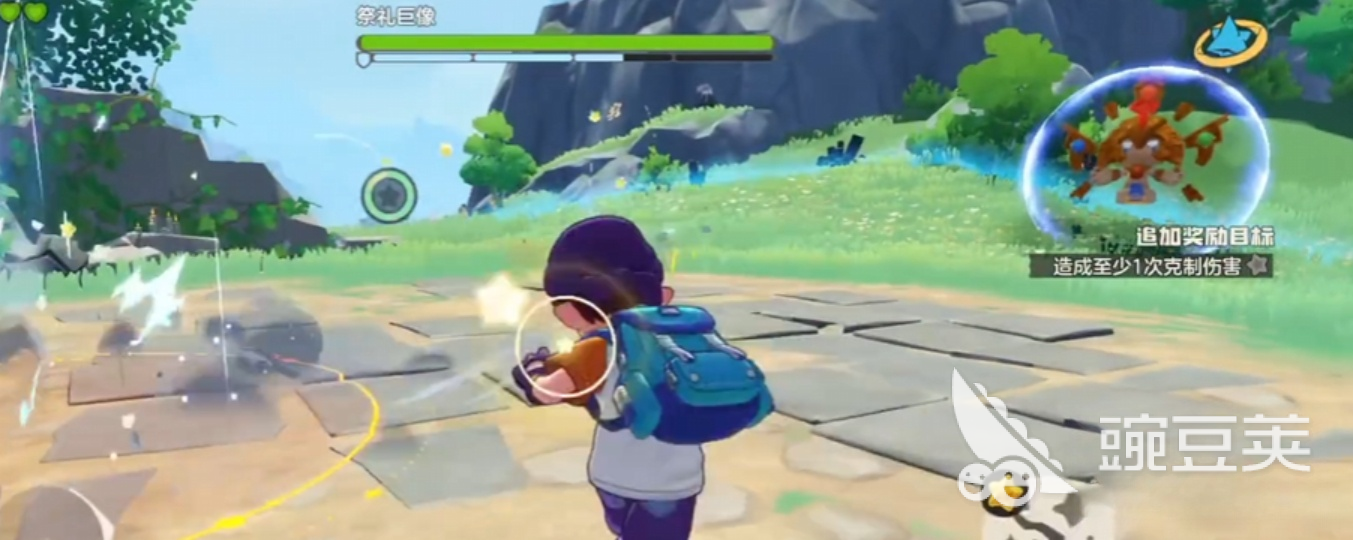 祭礼巨像的首阶段主要依赖地面突刺与追踪光波双重压制:脚下瞬发尖刺阵列,配合持续索敌的光波攻击,地面红色预警区为重要规避依据。建议全程维持安全距离进行输出。第二阶段环境发生属性分化,地面呈现两种不同元素属性区域,此时携带对应属性克制的精灵参战,可显著提升破防效率与战斗容错率。