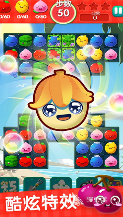 一个水果主题休闲消除类手游,通过滑动交换相邻水果,让三个及以上相同水果横竖连成一线即可消除,消除四个或五个相同水果能生成炸弹、彩虹等特殊道具,触发大范围消除效果,连续消除还有额外加分。游戏有数百个关卡,关卡目标包含收集指定水果、清除冰块等类型,而且一直保持新关卡的更新速度。