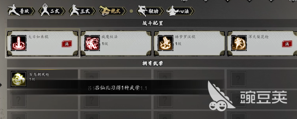 这里要注意,女帅留书不是拿到就能直接触发完整剧情。它更像是一个后续挑战的开启条件。按照提示去看,会发现需要修满三门指定武学。飞将戟法是其中很关键的一门,另外还有相关武功也要一起补起来。流程里比较容易卡住的地方,是百鸟朝凤枪这门枪法。因为在谭城这段时期,它还没有开放学习,所以很多人会以为自己漏了步骤,其实不是,单纯是时间还没到。