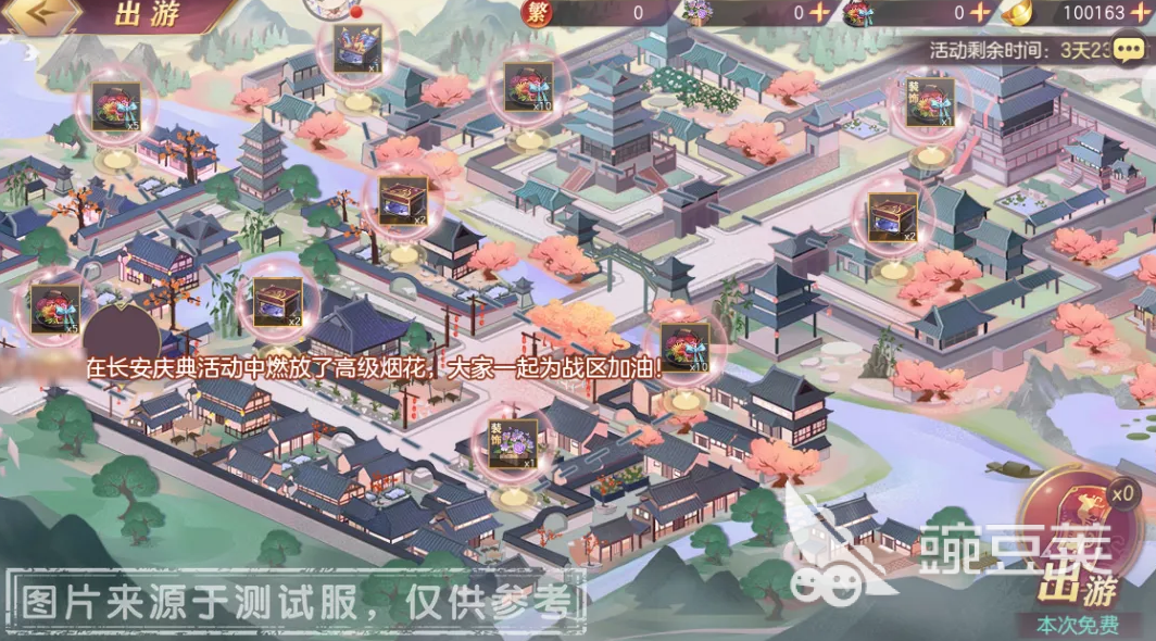 拿到出游券之后,去活动主界面右下角点「出游」进入界面。消耗出游券,可以随机游历一定步数,累积够指定步数就能领奖励,比如「烟花礼盒」和「高级花篮」这些。步数是随机增加的,所以具体几次能到不好说,多跑几次就行。