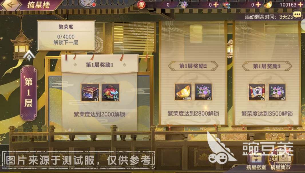 繁荣度累积够了,就能解锁「摘星楼」的各层奖励。烟花礼盒、庆典花篮、高级花篮这些都有。更重要的是,每解锁十层摘星楼,还能选一个「摘星密室」大奖——魂将碎片二十五选一、命魂信物任选巅峰九、魂宠碎片任选巅峰九、善灵灵魄任选巅峰九、风物志任选长安九、铸鼎象物风物志任选,全是硬通货,能选自己最需要的那个。
