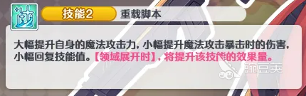 二技能,是她维持强度的另一块拼图。这个技能,会先大幅提高自己的魔法攻击力,再小幅提升魔法暴击时的伤害,同时还会回复一些技能值。对一个靠连结爆发带队的人来说,技能值回复很重要,因为这代表她能更快转起来。更重要的是,当领域已经展开时,这个技能的效果还会变强。也就是说,她的技能和连结爆发之间,不是分开的,而是一环接一环。开出领域后,她自己会更强,之后的输出和循环也会更顺,这种自我推进能力,让她在长一点的战斗里,表现更亮眼。