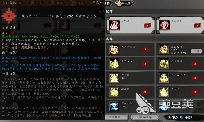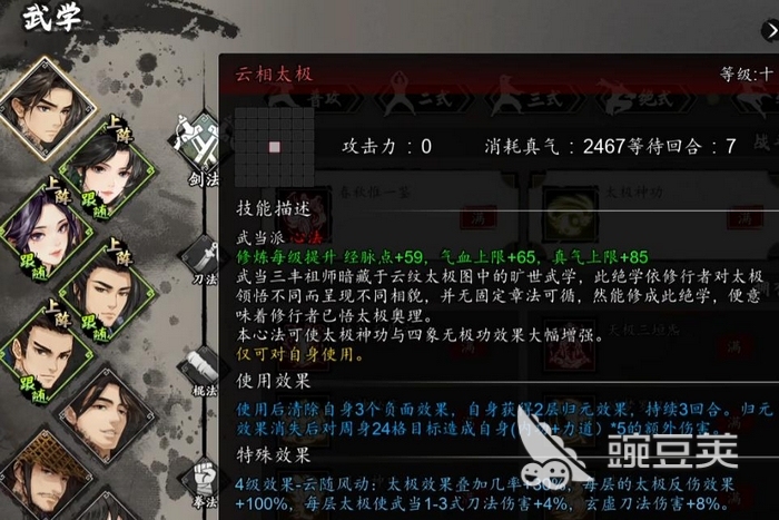 实战层面,流云太极剑采用“太极剑—太极拳”交替释放机制。每次成功施展,均可叠加1层特殊增益效果:既提升下回合所释放招式的伤害数值,同时为角色生成对应层数的气血护盾,持续生效2回合。该设计使该武学兼具输出强化与生存防护双重能力,是当前版本中少有的攻防一体化红色武学。