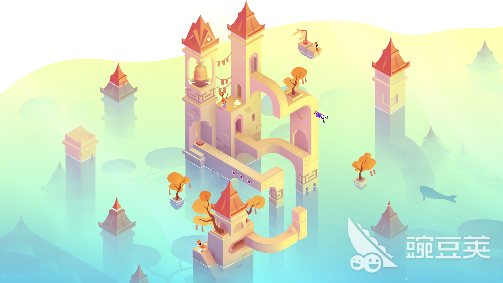 玩法层面,纪念碑谷3延续系列标志性空间错觉设计,核心操作围绕建筑结构的旋转与位移展开,引导主角突破常规透视限制,构建可行路径。相较前作,本代强化了交互维度——除基础旋转平台外,新增形态切换阶梯、动态响应机关等多元机制,解谜逻辑从纯视觉转向“观察—预判—验证”闭环,对空间思维提出更精细要求。