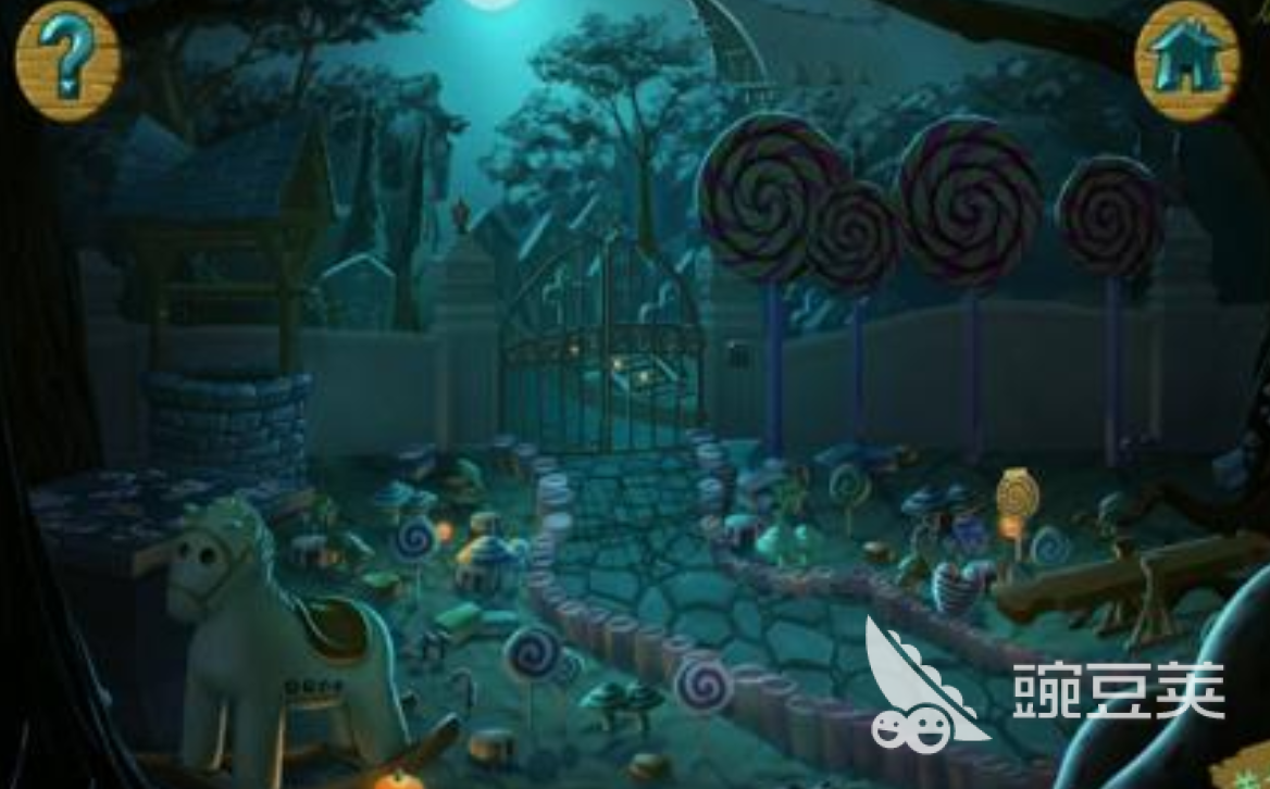 第二关转入“糖果屋”,难度显著提升。空间结构更富层次,解谜依赖道具联动与方向逻辑。玩家需先拾取棒棒糖状物品,通过拼图组合获得小刀;屋内东、南、西、北四个方位的棒棒糖装置实为操作指引,提示正确动作序列。随后将木柄插入指定接口,并依方向密码完成输入,成功激活后获得绿色眼睛道具。使用小刀割断绳索,方可继续收集新物品,为第三关储备必要资源。本关强调细节捕捉力与操作耐性,任意环节疏漏都将阻断解谜路径。