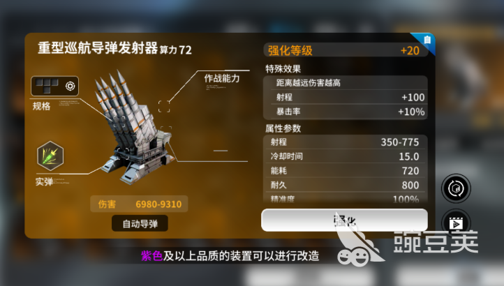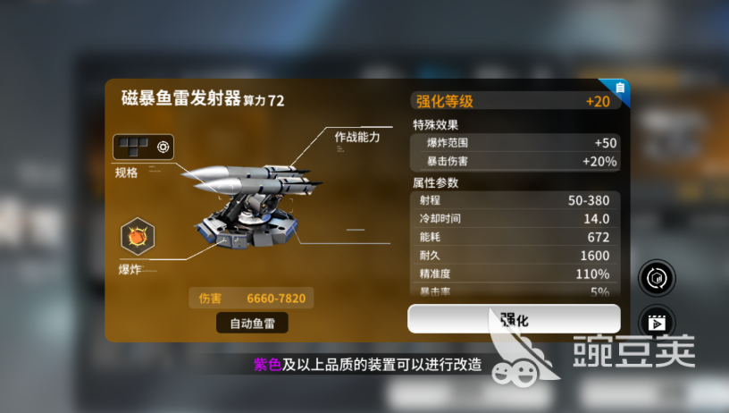 自动武器里【磁暴鱼雷发射器】(高能鱼雷发射器)就是鱼雷类武器的强度标准。鱼雷是带有AOE伤害的一种爆炸类武器,基本伤害值比其他的兵器高很多,小范围爆破会使得重叠区域内的敌人生命值被降至一半或者直接死亡。磁暴鱼雷之所以能脱颖而出,是因为它在经过三次改造后获得的技能是暴击伤害加20%。只要玩家的战舰暴击率足够高,它爆发的伤害就会大于大部分鱼雷,是清场的利器。但是玩家需要注意的是,鱼雷射程短、容易被拦截,使用时要配合其他武器进行掩护。