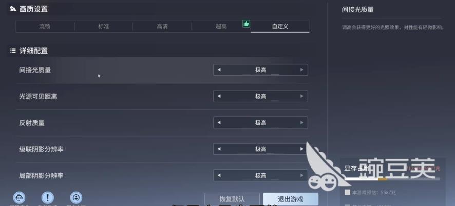 锐化数值建议设在10到30之间,不用拉太高,拉高了画面反而会有点奇怪。间接光质量选极高,阴影选高。材质细节、纹理质量、模型质量这几个选项,条件允许的话全部拉到最高,画面细节会好很多,看起来更真实一些。
